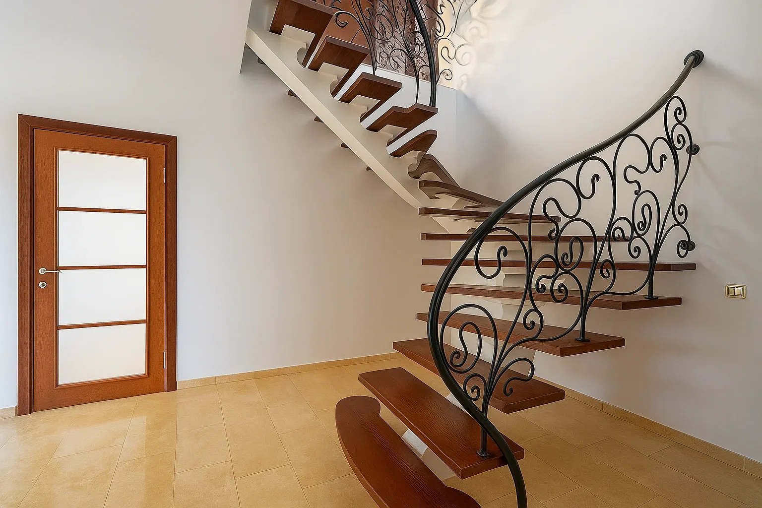 Архитектурная выразительность. Забежная лестница на монокосоуре — это не просто конструкция, а элемент архитектурного акцента. Она формирует динамику интерьера и подчеркивает его индивидуальность.