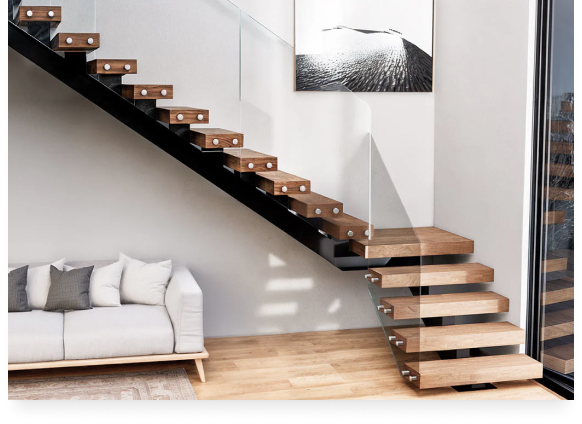 Визуальная легкость. За счет центральной балки и отсутствия подступенков конструкция выглядит «воздушной», не утяжеляет интерьер и пропускает максимум естественного света.